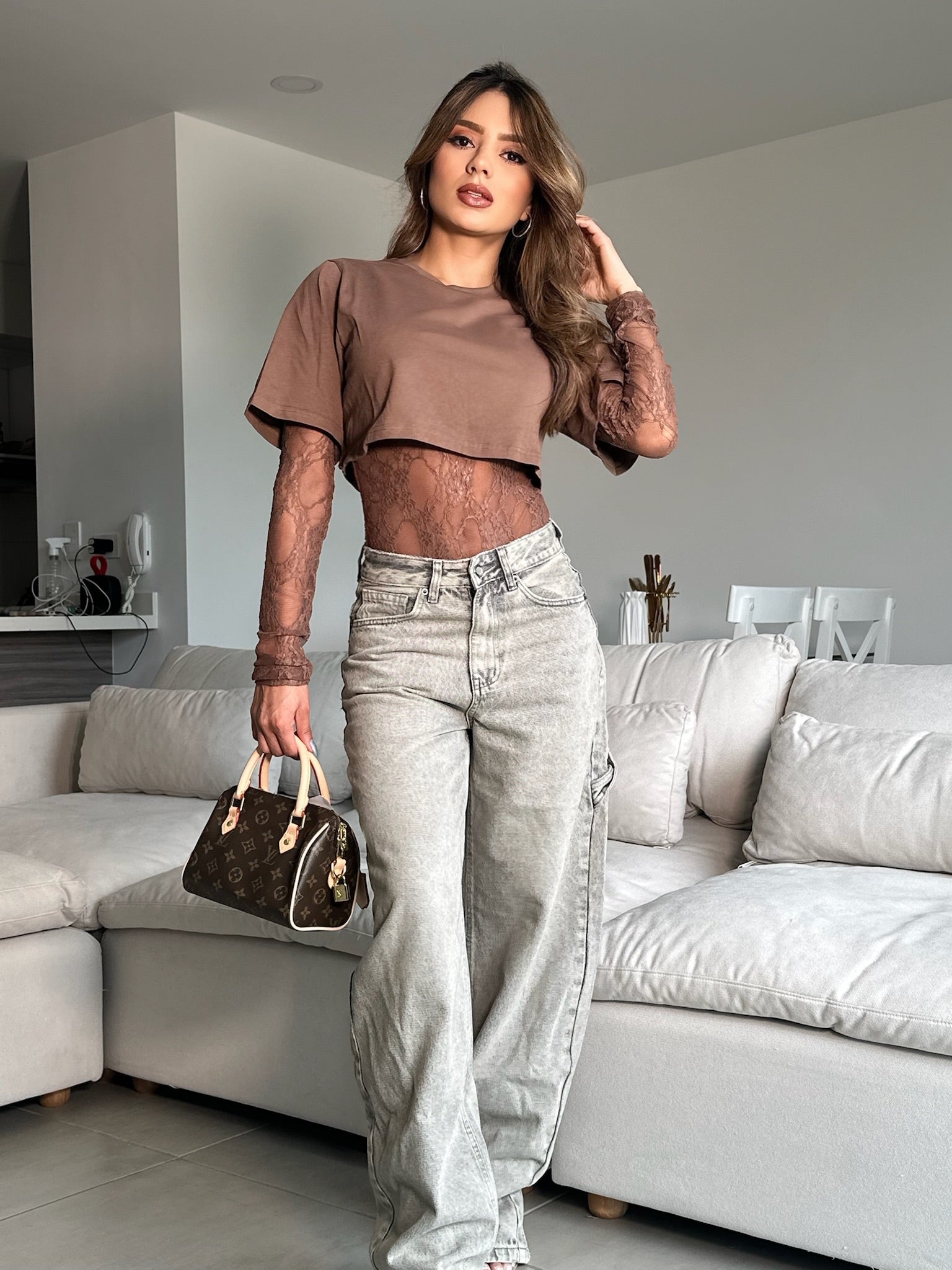 Body en encaje color café, de manga larga y diseño ajustado que resalta la silueta. Con transparencias delicadas y un estilo elegante pero atrevido, es una prenda versátil para combinar con jeans, faldas o pantalones de vestir, ideal para looks nocturnos o salidas especiales.