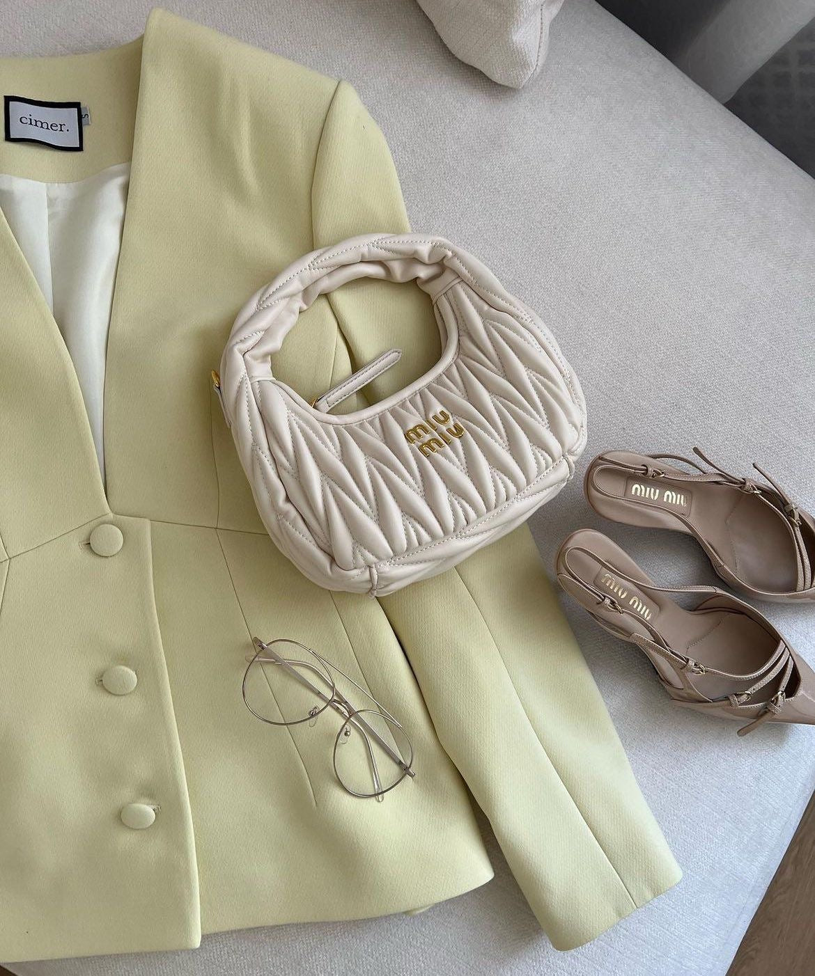 Bolso miu miu 1.1 diseño acolchado nude con textura elegante, compacto, femenino y versátil, ideal para completar outfits sofisticados con un toque de lujo moderno.