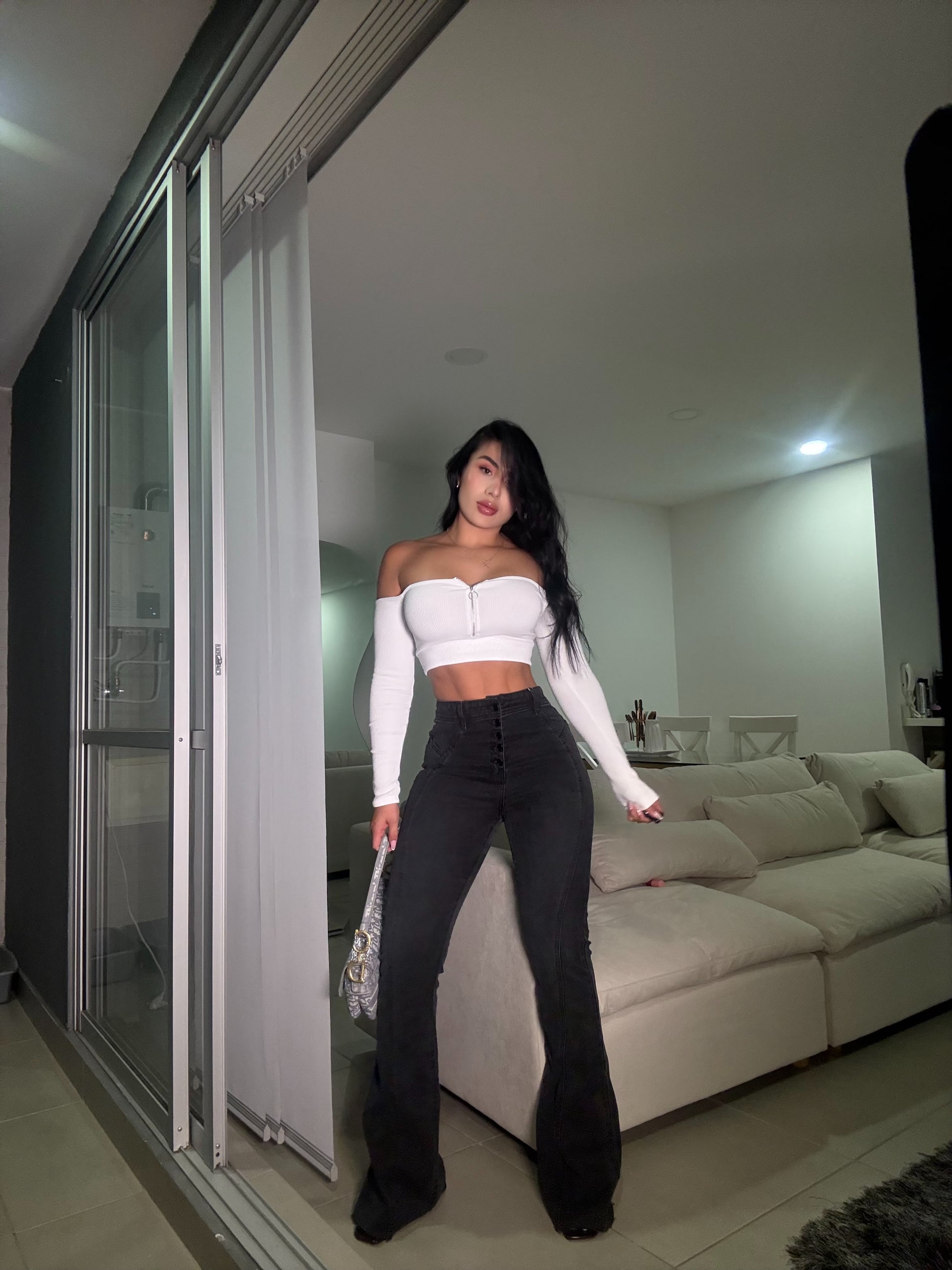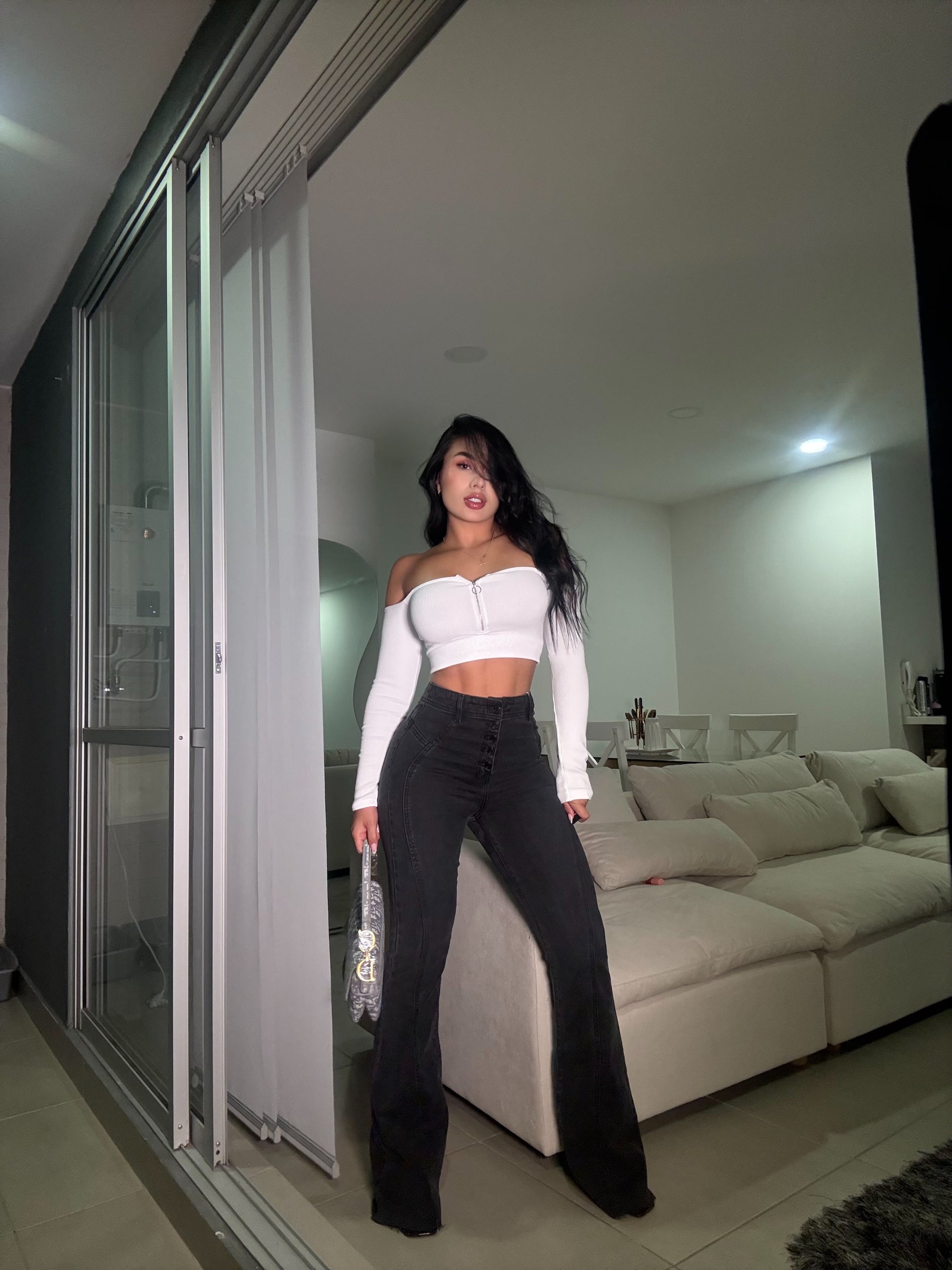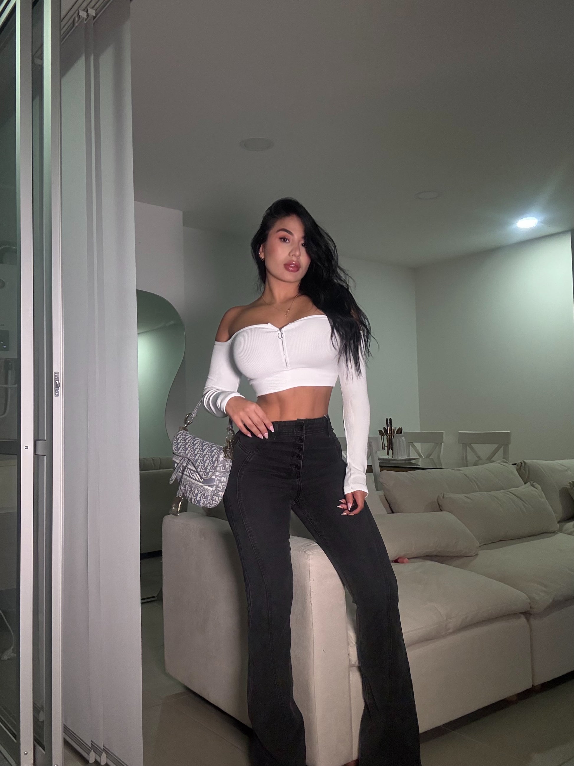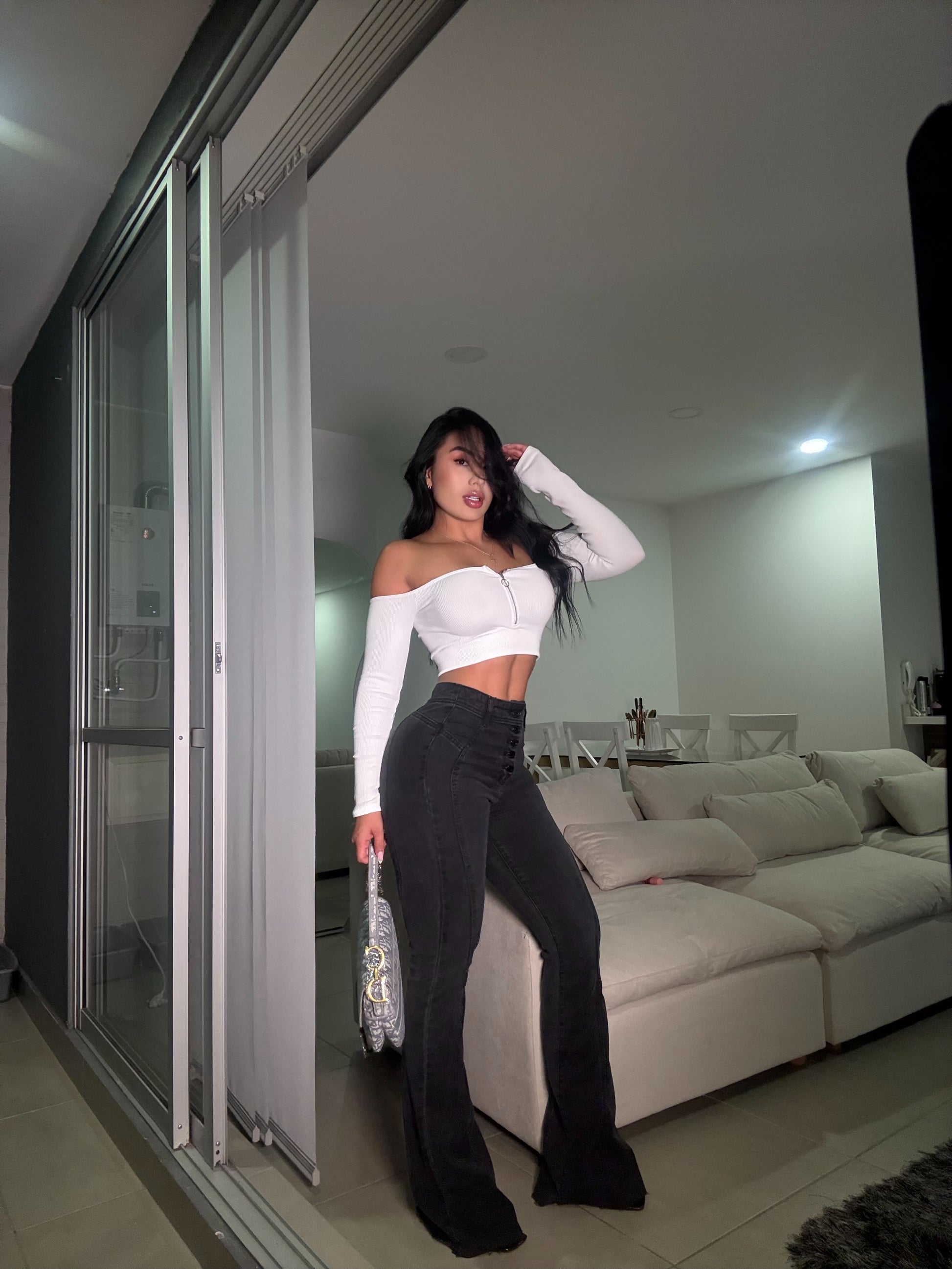Buzo crop negro de manga larga con cierre frontal, escote bandeja y ajuste ceñido. Moderno y versátil para cualquier look.