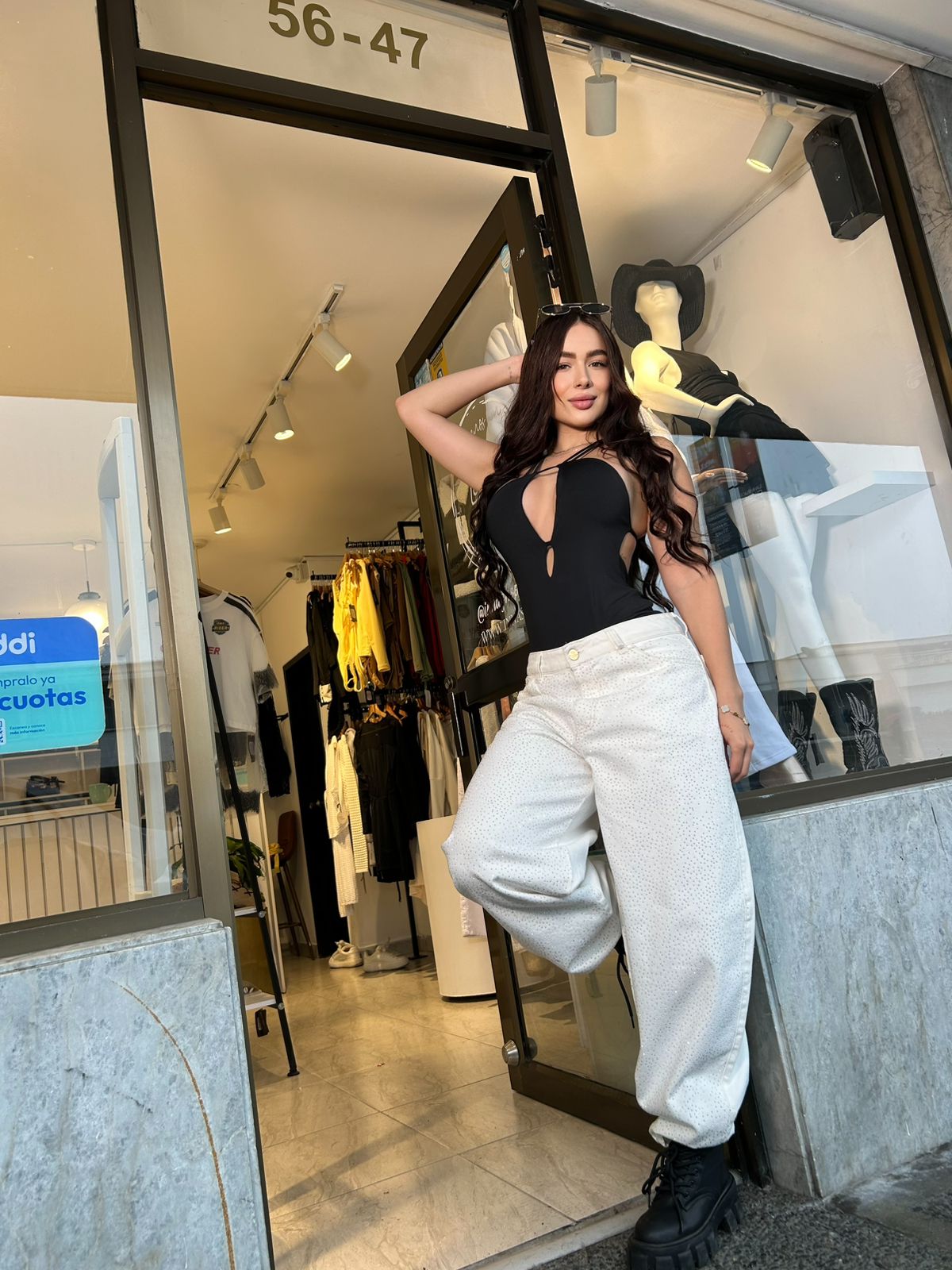 Pantalón blanco de tiro alto con bota ancha, y detalles brillantes que aportan un toque sofisticado y llamativo. Ideal para looks elegantes y modernos, combinando comodidad con un estilo chic.