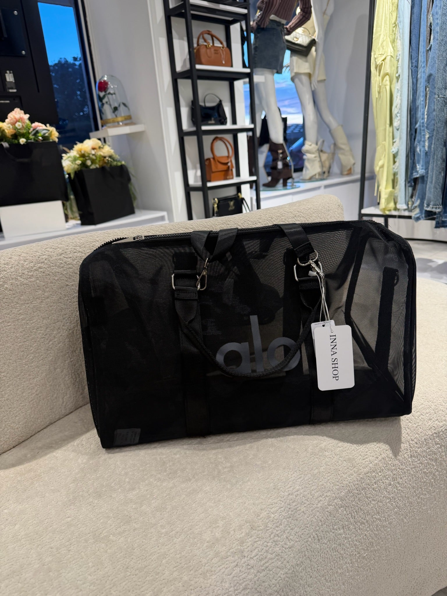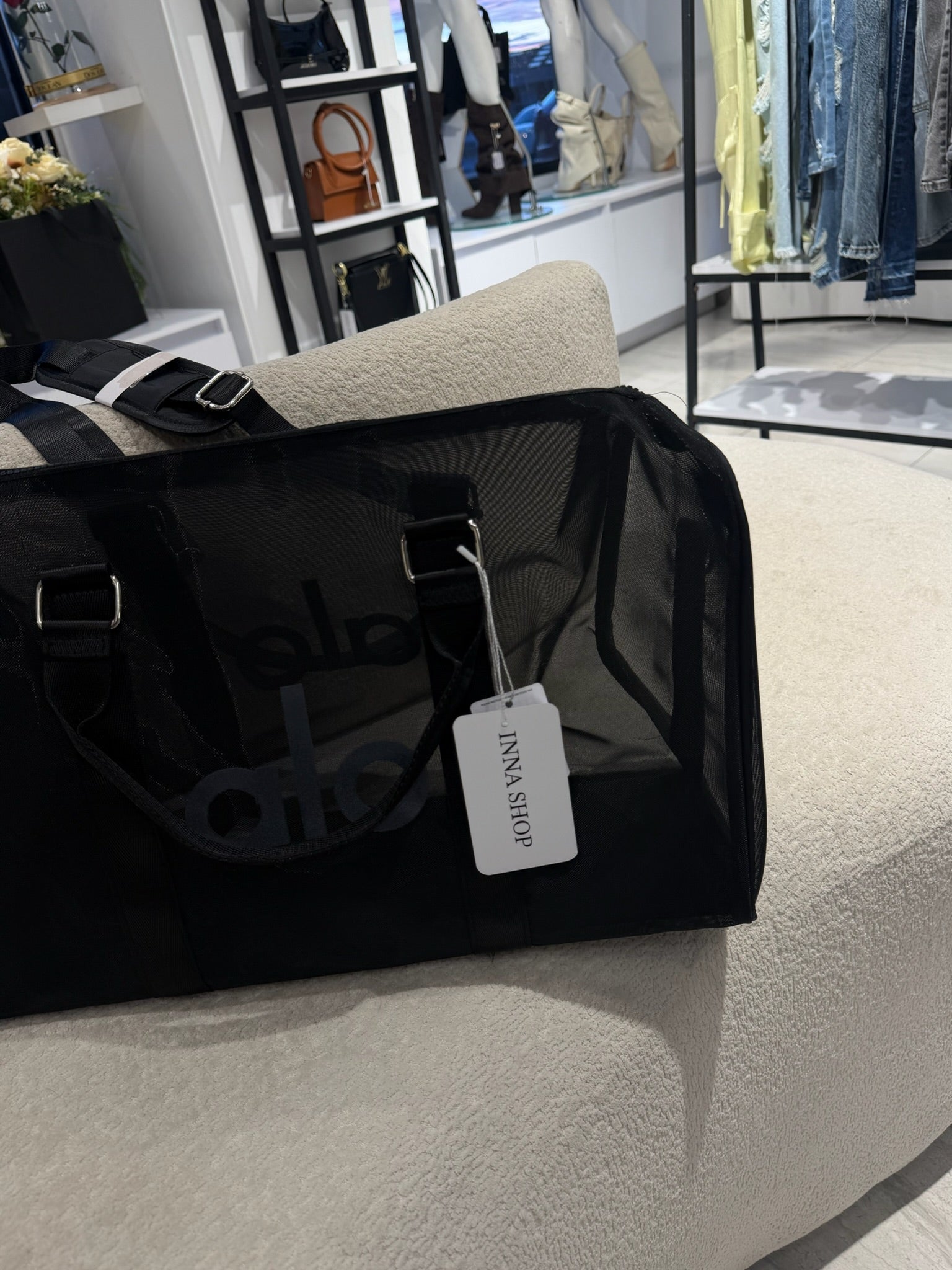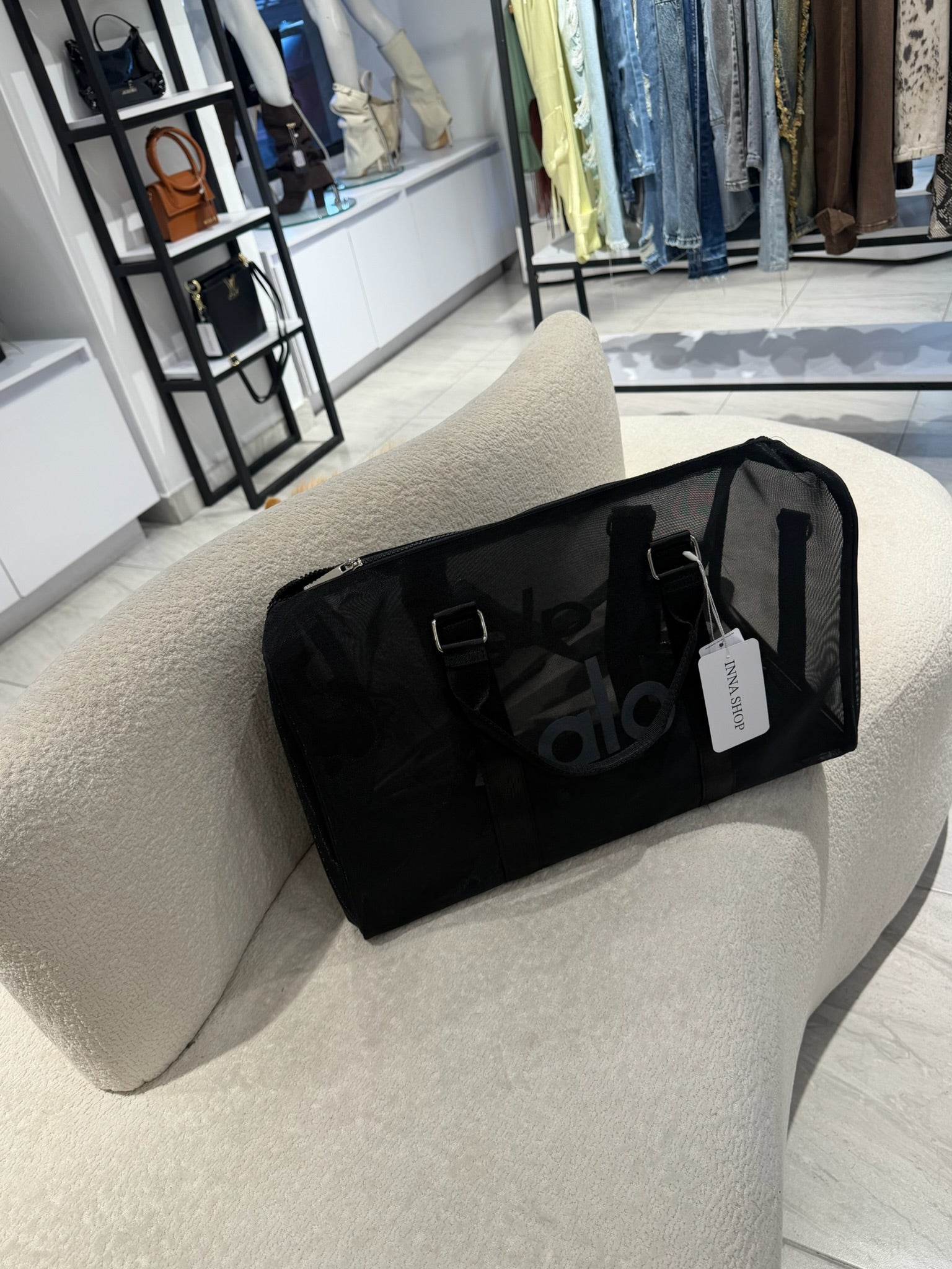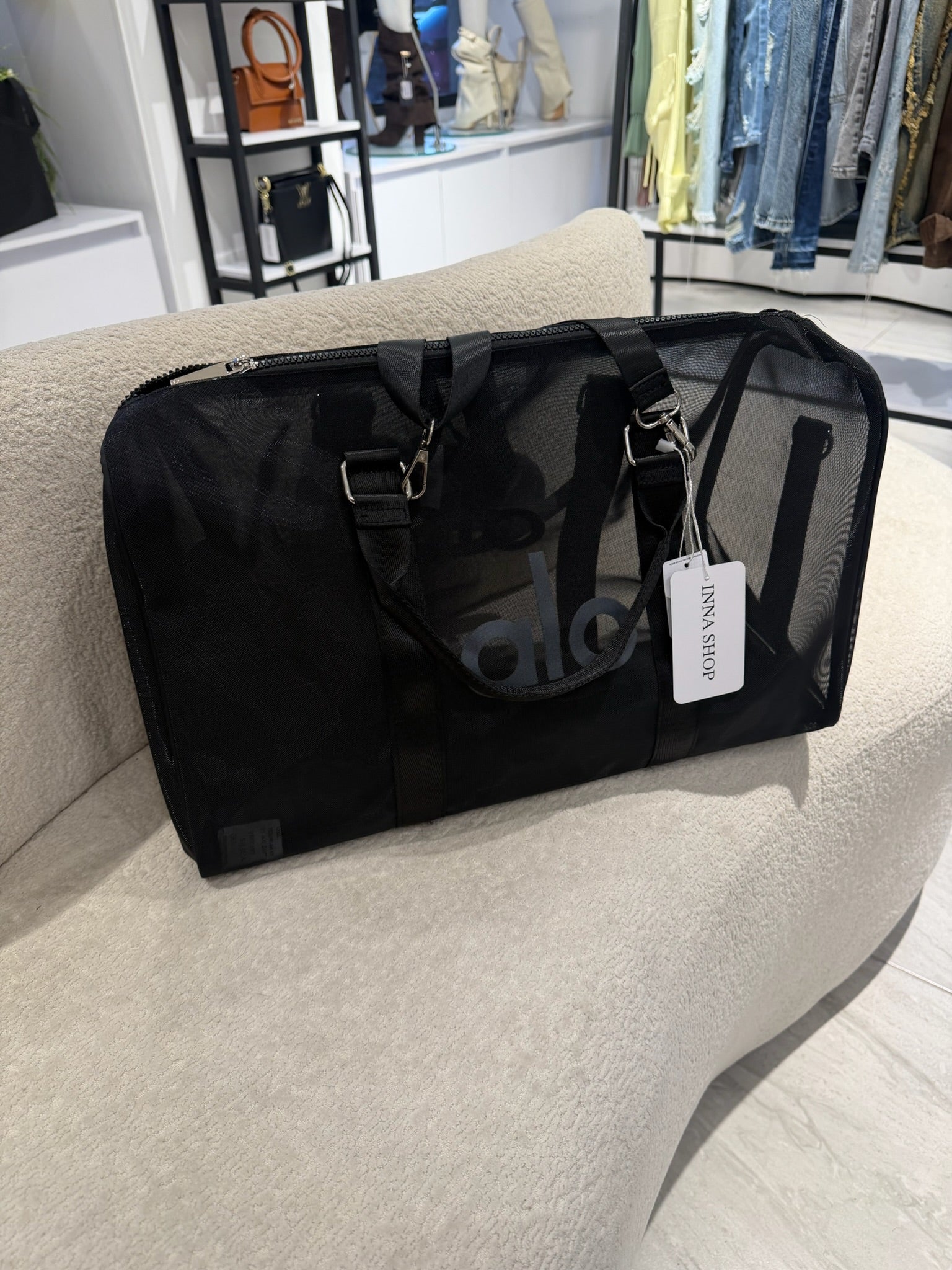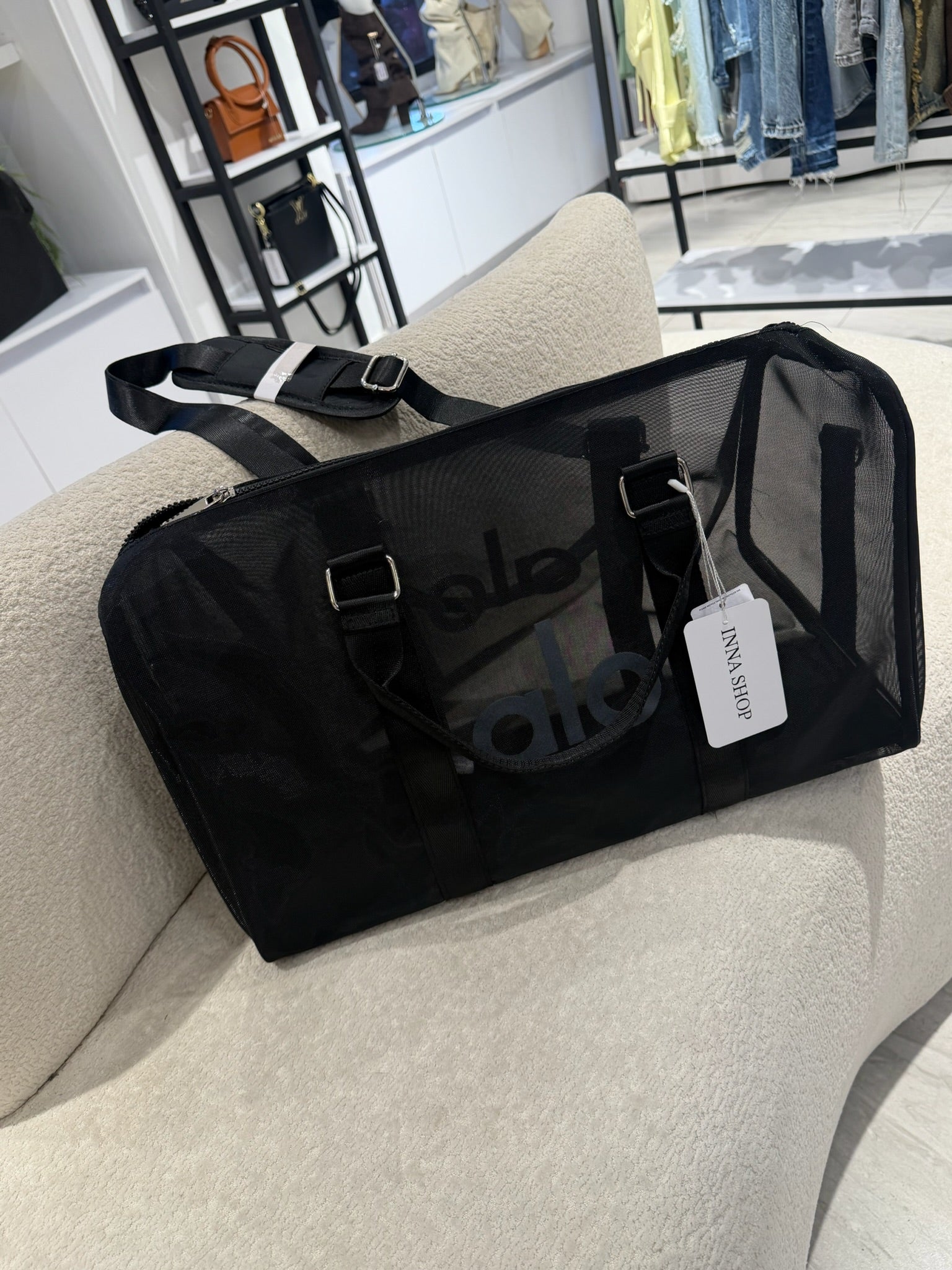 Maleta de Alo Yoga en color negro, tamaño grande, con diseño en tela tipo malla transparente que le aporta un estilo moderno y diferente. Amplia, ligera y perfecta para llevar todo con comodidad, ideal para viajes o para el día a día con un look cool.