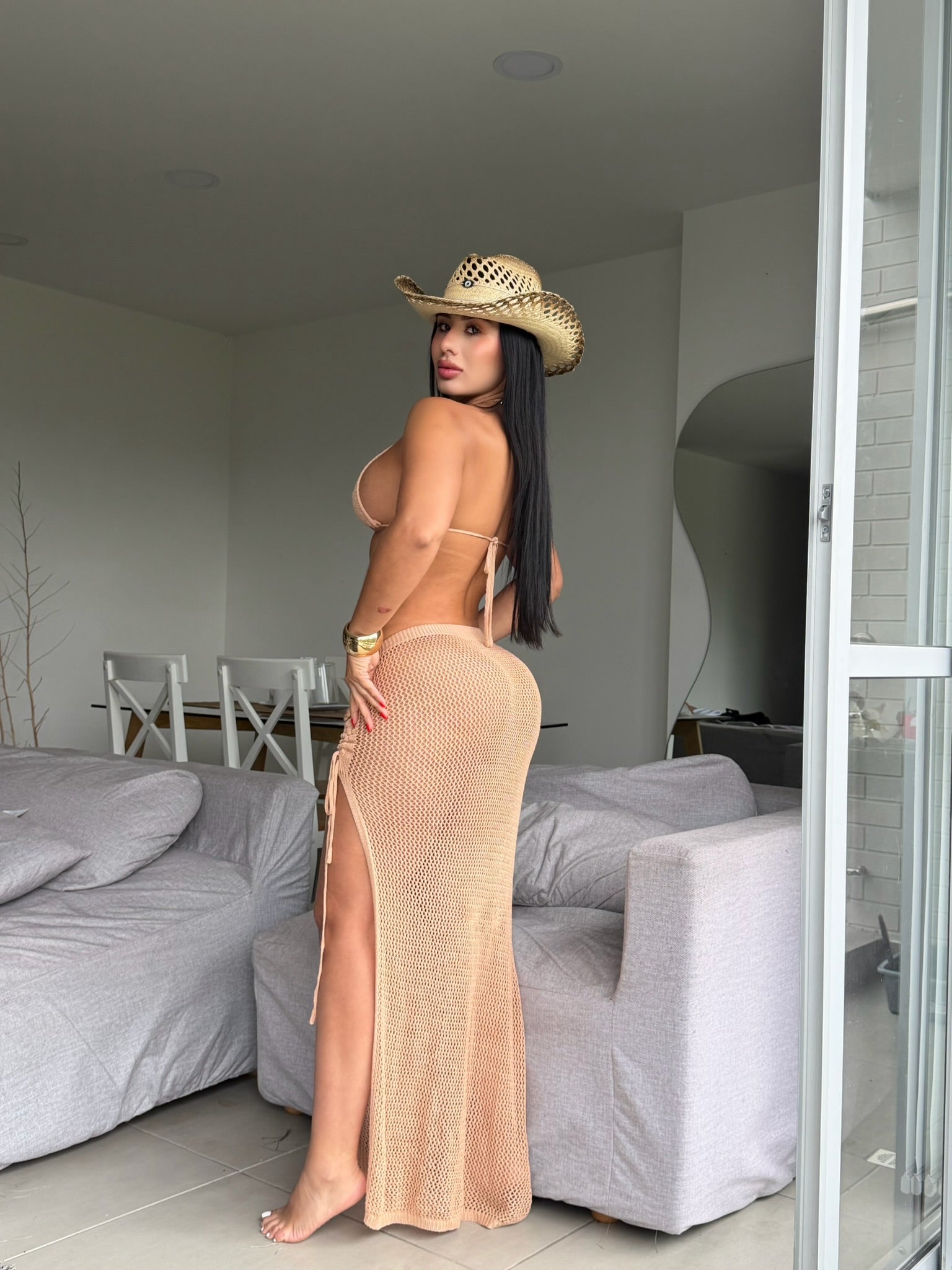 Crop top sencillo y falda larga con detalle de flores, que aportan un toque femenino y llamativo. Un look moderno y en tendencia, ideal para festivales y días de verano.