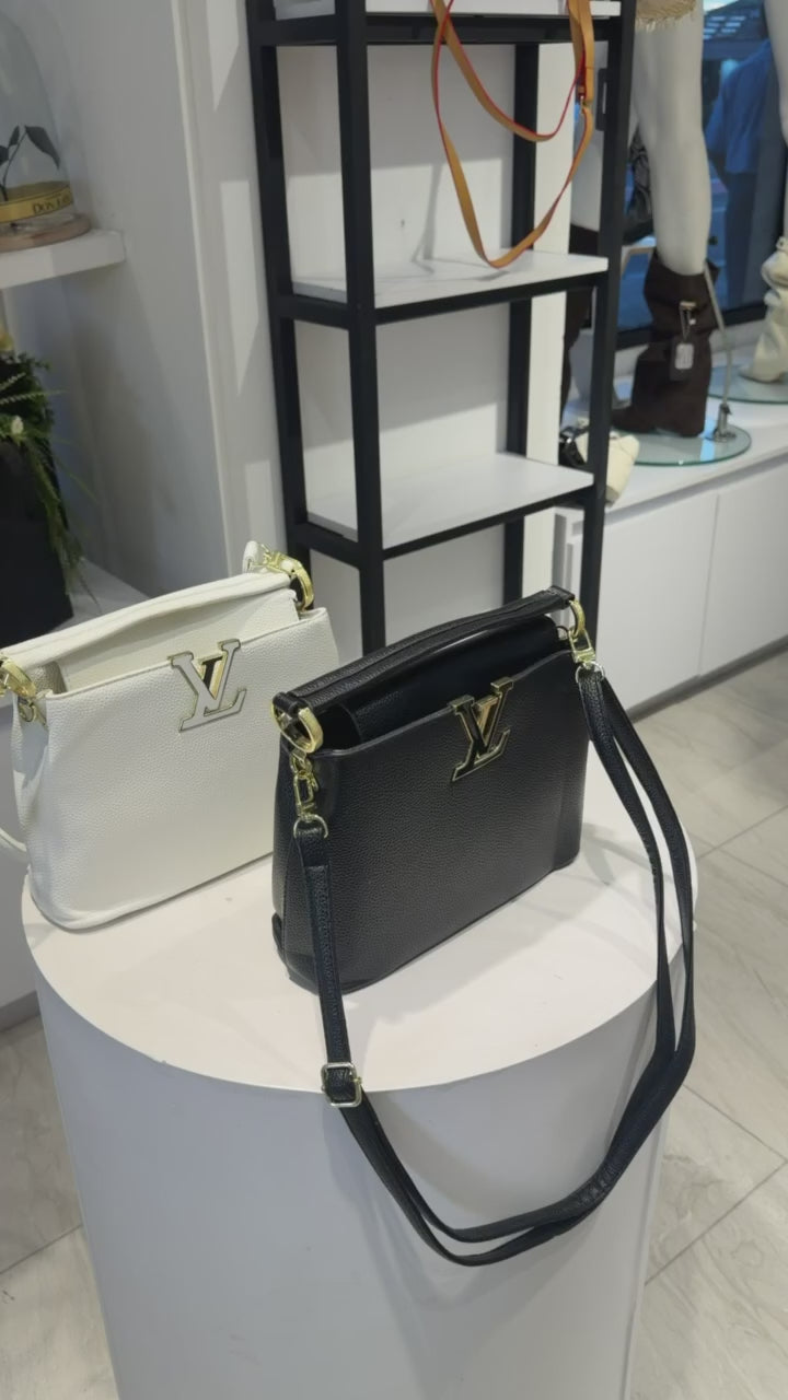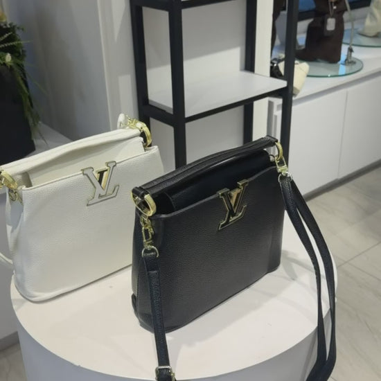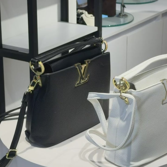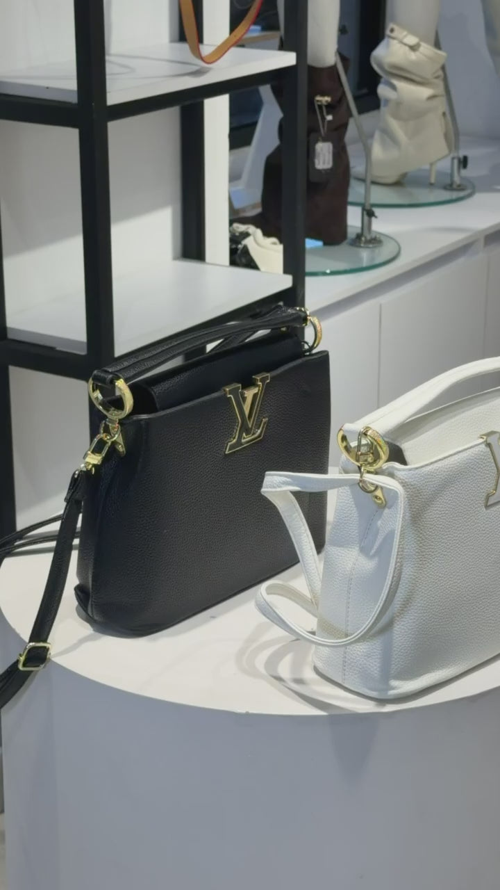 Bolso Louis Vuitton negro de tamaño mediano, con diseño elegante y atemporal. Cuenta con correa para llevar manos libres y detalles icónicos del logo en acabado dorado que elevan todo el look.