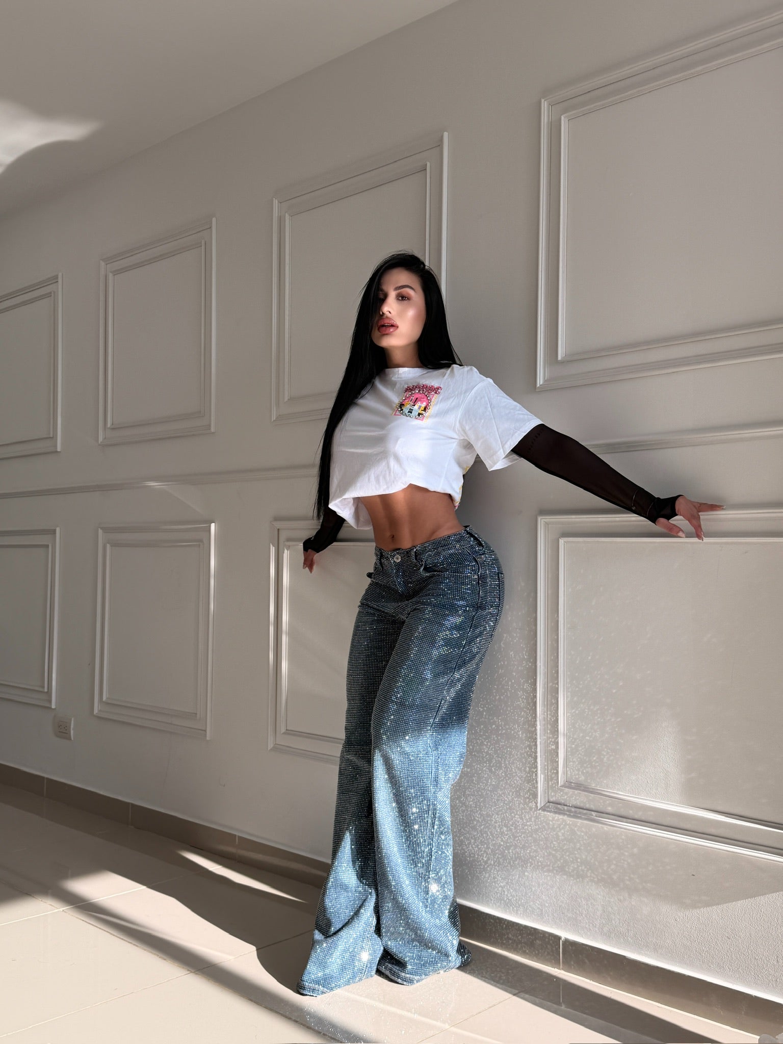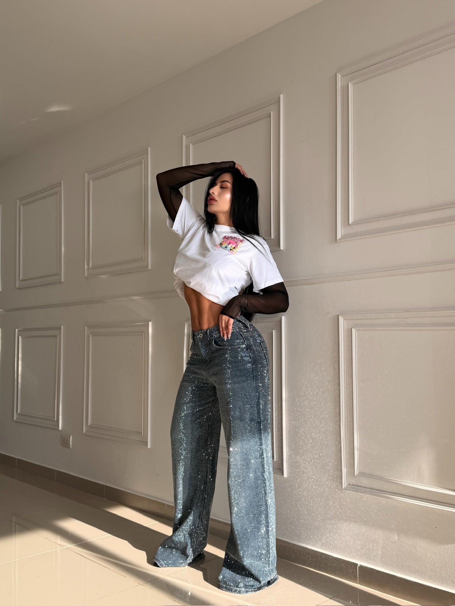 Pantalón de silueta recta confeccionado en denim con acabado brillante que eleva cualquier outfit. Su diseño de tiro medio/alto estiliza la figura y aporta un look sofisticado y llamativo. Ideal para combinar tanto con prendas básicas como con tops más elaborados. Perfecto para destacar de día o de noche.