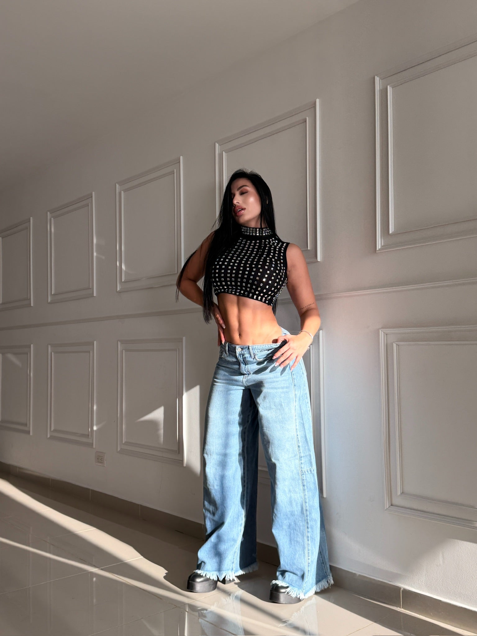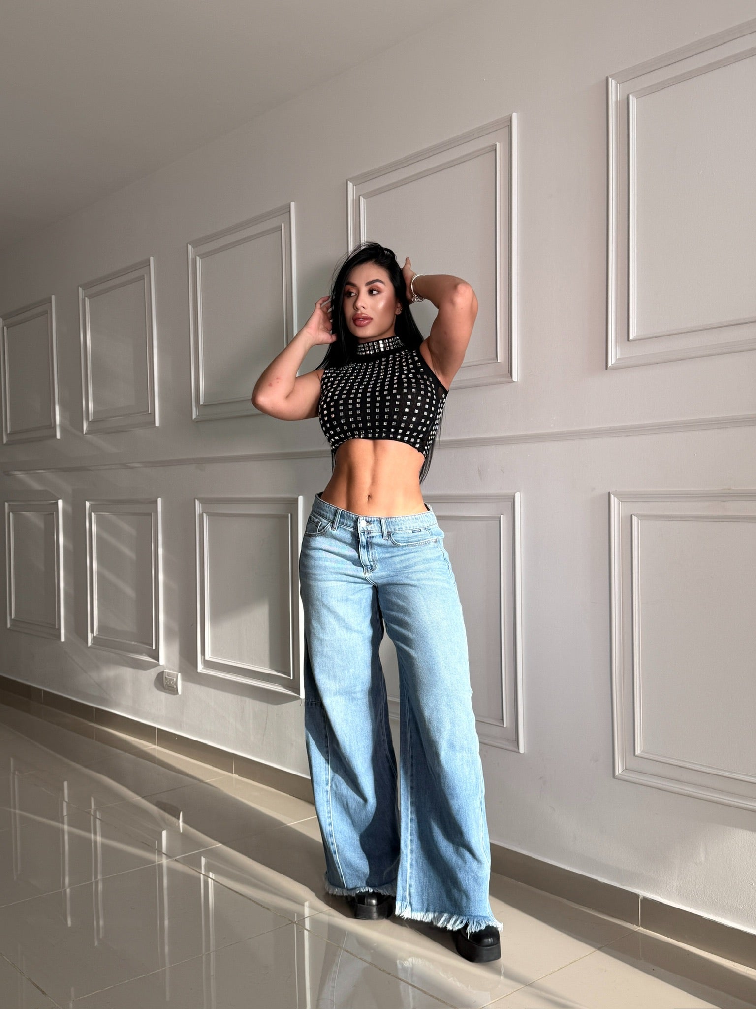 Blusa tipo crop confeccionada en tela elástica que se ajusta cómodamente al cuerpo. Su diseño sin mangas y cuello alto estiliza la silueta, mientras que los detalles de taches aportan un look moderno, audaz y sofisticado. Perfecta para combinar con jeans de tiro alto o pantalones amplios y crear outfits llamativos tanto de día como de noche.